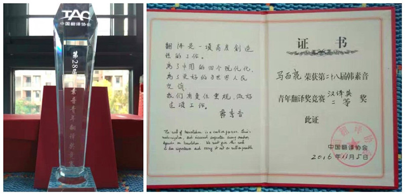 2016年11月5日上午,由中国译协《中国翻译》编辑部与上海交通大学402永利集团联合举办、华为技术有限公司协办的第28届“韩素音青年翻译奖”竞赛颁奖典礼暨上海交通大学翻译系成立大会在上海交通大学402永利集团举行。公司402永利集团马百亮老师荣获汉译英二等奖(一等奖空缺),英语专业2016届毕业生杨榕荧荣获英译汉优秀奖。