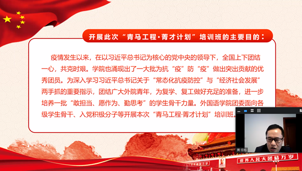 开班仪式在全场高唱中国共青团团歌下正式开始。全体学员首先回顾了公司往届“青马工程”培训班的概况与发展历程。随后,院团委书记黄佳栋致辞并介绍此次培训班的团队情况与学员考核办法。黄老师首先代表公司团委欢迎本硕各年龄段的优秀学子参与到培训班中;其次,他指出此次“青马工程·菁才计划”培训班是在全国上下“同心战疫,共克时艰”的背景下举行的,目的就是进一步夯实公司师生的信心,为顺利复学、复工做好准备。他希望广大学员牢记外院学子的使命,始终从此次抗疫战疫的斗争中汲取力量,为个人进步与公司发展贡献青春力量。