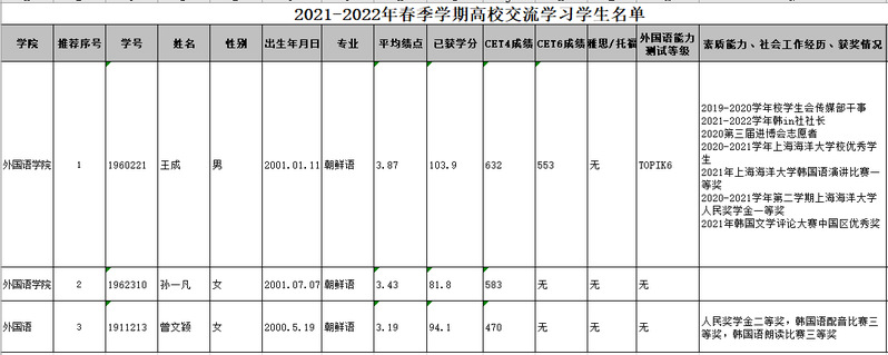 根据教务处文件《关于选派2021-2022学年春季学期赴韩国明知大学交流学习的通知》要求,经个人申请,公司审核,现将402永利集团2021-2022年春季学期赴韩国明知大学交流学习候选人上报教务处,特此公示。