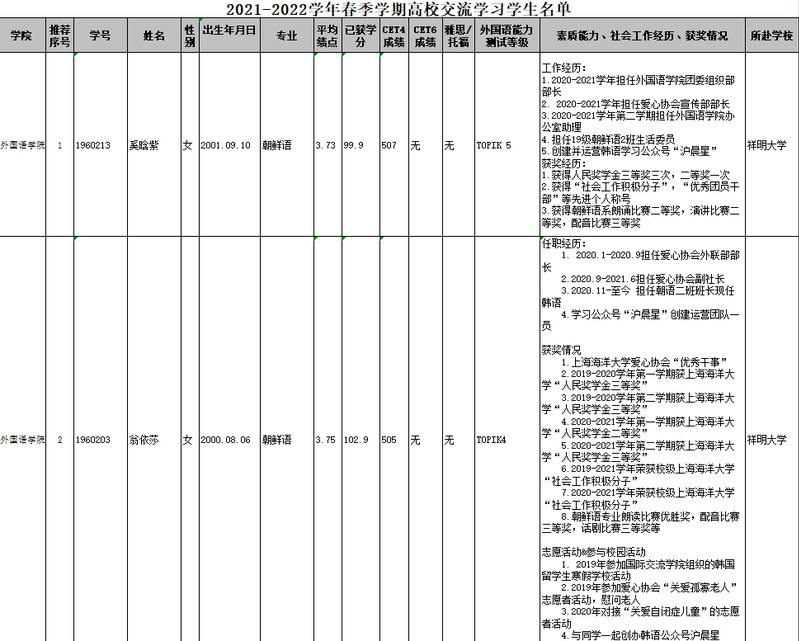 根据《关于选派2021-2022学年春季学期赴韩国祥明大学交流学习的通知》、《关于选派2021-2022学年春季学期赴韩国淑明女子大学交流学习的通知》要求,经个人申请,公司审核,现将402永利集团2021-2022年春季学期赴韩国祥明大学、韩国淑明女子大学交流学习候选人公示。