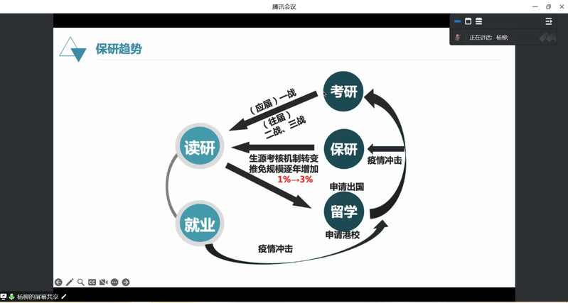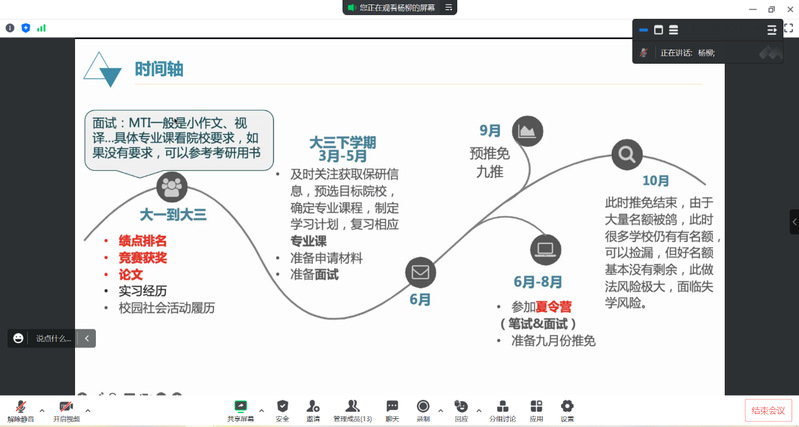活动开始,日语专业的两位同学分享交流。汪雅雯同学重点讨论了3个问题:1.充分利用公司资源进行专业学习,同时可以在闲暇时找公司的外教老师练习口语,扎实基础。2.大家要选择好公司,平衡好自己的时间。3. 多关注各个公司研招网夏令营通知,提前报名。随后薛芹同学补充道:大家到要关注各个院校夏令营的消息,有的院校如果拿到优秀营员证明,即便无保研资格考研也可能会有免复试资格。