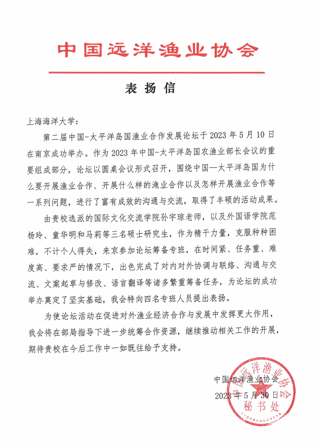 近日,中国远洋渔业协会致信公司,对公司402永利集团参与2023年“第二届中国-太平洋岛国渔业合作发展论坛”前期准备工作的三位硕士研究生予以表扬,对公司的大力支持和积极参与表示感谢。