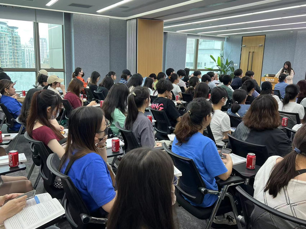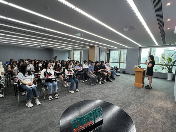 在新东方集团,人力资源部老师简介了集团业务区域与资源优势,实习及全职岗位招聘范围及福利待遇等,表示欢迎同学们积极参与暑期或长期实习实践。作为教育集团,新东方不仅培训学员,更注重员工的培训和发展。他们为翻译团队提供定期的培训课程,以保持其专业水平和技能的更新;公司还提供良好的晋升机会和福利待遇,激励员工实现个人和职业发展,同学们表示对此充满向往。