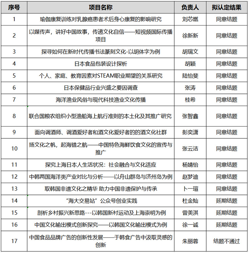 经所有项目组提交材料、现场答辩,公司评定项目组根据结题材料、答辩情况以及提交的成果进行评定,公司2023年度老员工创新创业训练计划项目需按期结题17项(市级6项、校级11项),其中正常结题13项,延期结题3项,结项不通过1项。具体评定结果公示如下: