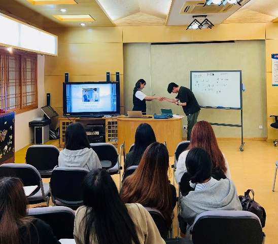 第三节(5月14日):元音ㅐㅔㅚㅟㅢ辅音ㅁㅂㅅㅈ的教与学。本次对上述韩语字母的发音、书写进行了教学与拓展,继续邀请到了两组公司韩国交换生,介绍相关韩国文化。第一组由金天和金宣映两位职工介绍韩国货币,她们从币值及货币上印有的人物和图案进行介绍,使大家对韩国货币、韩国历史名人和韩国历史名画有所了解。第二组由徐宙延和李真雨两位职工介绍韩国问候礼仪,从三种不同的问候方式到在长辈后辈之间使用的问候用语,还有“吃饭”在韩国问候中的特殊含义,他们通过直接演示和小问答的形式帮助同学们深入了解韩国问候礼仪中的规则。