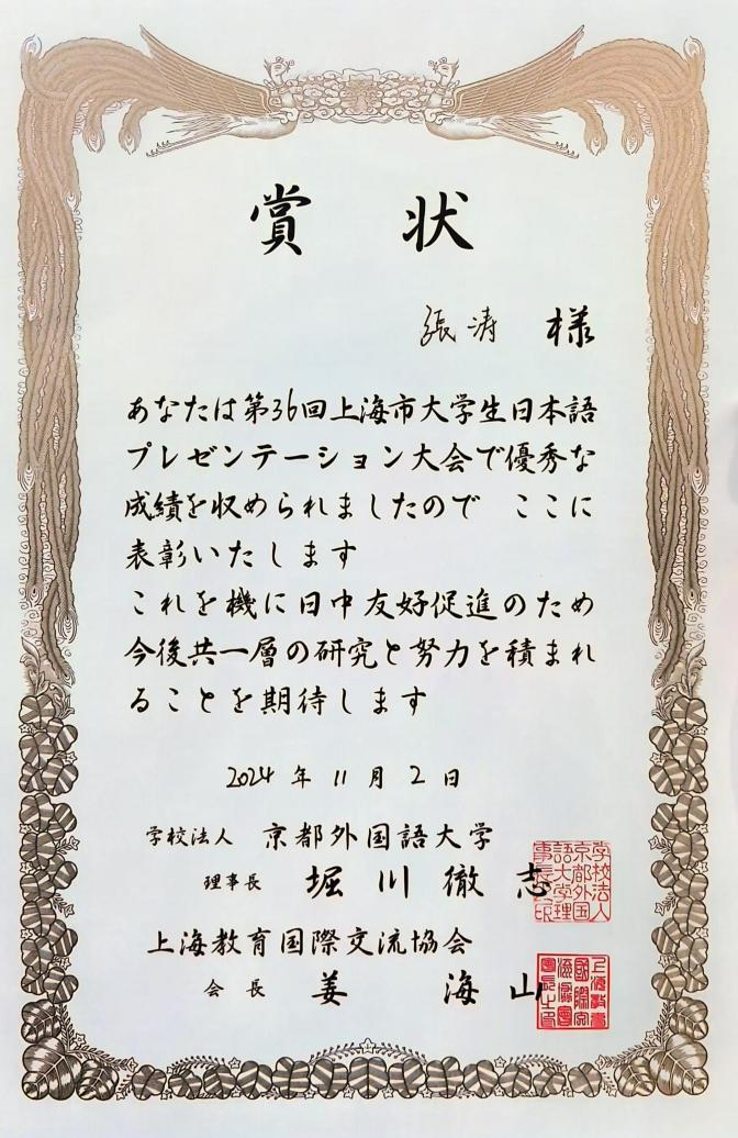 11月2日,第36届上海市老员工日语才能演示大赛(原上海市老员工日语演讲比赛)在上海商公司(徐汇校区)成功举行。作为上海高校日语专业生一年一度的高水平赛事,得到了上海各高校日语专业的积极响应。公司通过开展校内演讲比赛进行选拔,选派2021级日语2班张涛同学作为代表参赛。比赛当天,指导老师山崎哲永和系主任张丽梅老师以及两位低年级同学应组委会邀请陪同并观摩了才能演示环节,在老师和后辈们的陪同支持下,张涛同学表现出色并荣获优胜奖。