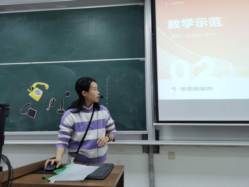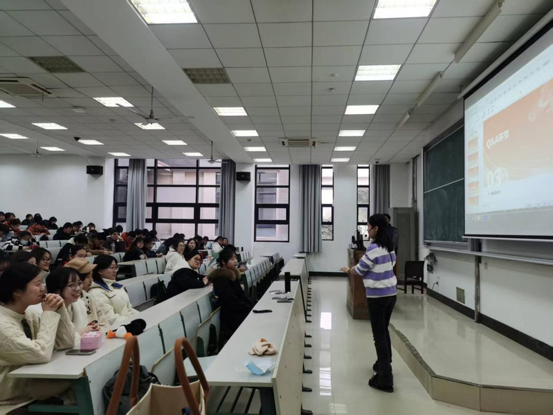 讲座开始,施清婧老师首先向在座的师生简单介绍了“学而思”的业务范围和三位培训师的相关背景。随后,李龙斌老师以“教学行业面试技巧”为题,从教学的“内功”和“外功”两方面为大家介绍了培训机构在面试试讲和日常教学的要求。之后,国际英语班培训师林百悦老师以一篇题为“the history of telephone”的课文为例进行了现场示范教学,为同学们展示了“学而思”国际英语班(小学学段)平时真实的授课状态,给在场的英语系老师和同学留下了深刻印象。讲座最后的“提问回答”环节,不少同学积极向几位培训师提问,包括如何去备课、如何吸引小员工注意力、是否可以到“学而思”参加实习等,显示了同学们对教育培训机构就业的浓厚兴趣。