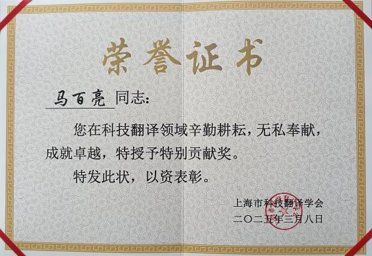 此次马百亮荣获上海科技翻译学会“特别贡献奖”,是对他多年来在翻译领域辛勤耕耘的最好褒奖。他以扎实的专业知识、严谨的治学态度和丰硕的翻译成果,为中外文化交流搭建了桥梁,同时也大大提高了公司在外语和翻译界的知名度和美誉度。