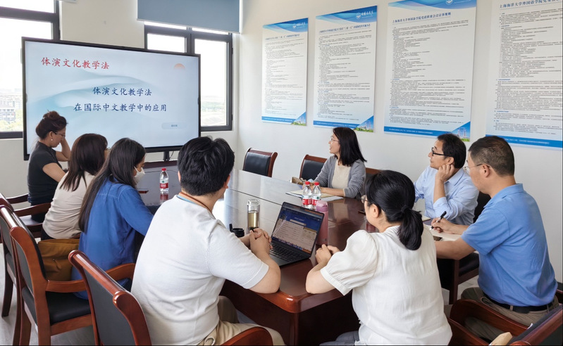 在研讨环节,教师们围绕主题展开深度交流。卢晓敏老师提出,体演教学法融合“身心社”三维实践,适用于中级以上汉语学习者,教师可通过“体验-实践-反思”闭环路径助力员工文化习得;滕新贤老师指出该方法突破传统语言形式与文化内涵的分离现象,为文化教学提供新范式;楼兰老师认为“体演教学法”结合了体验式学习与社会文化理论,既能提升语言能力,更能促进国际员工融入校园;沈庆会老师分享了如何将声调、汉字等教学难点融入生活情境,实现无痛化教学。