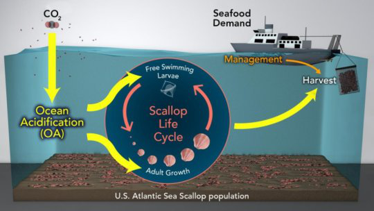 每年,渔民从美国东海岸的海域收获大量的大西洋扇贝,价值超过5亿美元。然而,伍兹霍尔海洋研究所(WHOI)的科学家们根据研究结果预测这些东海岸的渔场可能存在潜在的危险。随着地球大气中二氧化碳含量的增加,上层海洋的酸度逐渐上升——最坏的结果就是,在未来30到80年内扇贝资源数量将减少50%以上。然而,如果采取有效的渔业管理举措,并努力减少二氧化碳的排放,那么就有可能减缓这种资源数量减少的趋势,甚至阻止其发生。