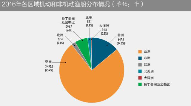 2016年世界渔船总数估计为460万艘,自2014年 以来没有变化。亚洲渔船数量最多,共计350万艘,占全球渔船总数的75%。