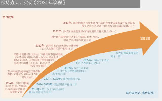 联合国《2030年可持续发展议程》中提出了17个可持续发展目标,粮食和农业是实现全部可持续发展目标的关键,其中多个目标与渔业和水产养殖直接相关,尤其是可持续发展目标14“保护和可持续利用海洋和 海洋资源以促进可持续发展”。