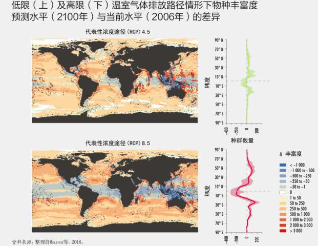 近期证据表明,向两极延伸会造成多数地区的本地物种丰度出现净增长,而热带区域的物种丰富度却会出现明显下滑(Molinos等,2016);但除气温变化外,物种丰度的格局最终还是要由多种本地因素决定。
