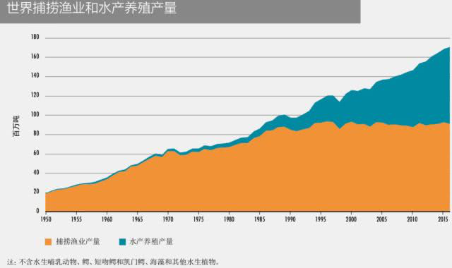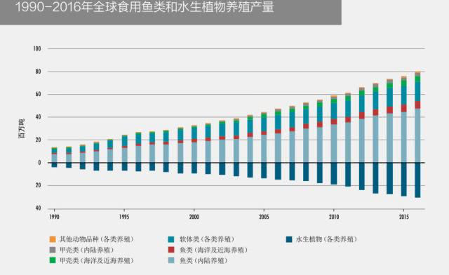2016年,全球鱼类产量达到约1.71亿吨峰值,水产养殖占总产量的47%,如扣除非食用(包括用于生产鱼粉和鱼油)产量,则水产养殖占总产量的53%。2016年,渔业和水产养殖产量初次销售总额约为3620亿美元,其中水产养殖产量占2320亿美元。