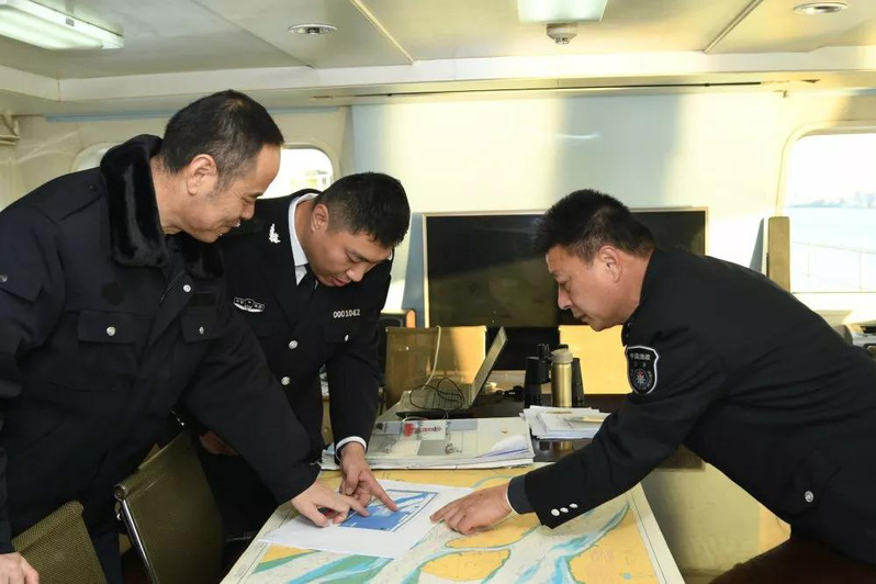 (图:中国渔政001船船长王增荣、长江办执法监督处干部朱治、中国海监江苏省总队三级调研员岳才俊共同研究巡航事宜)