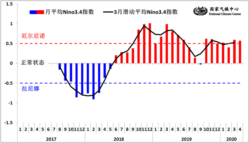 国家气候中心监测显示,2019年11月以来,赤道中东太平洋进入并持续维持厄尔尼诺状态,连续5个月 Niño 3.4指数的滑动平均值分别为 0.6℃、0.5℃、0.5℃、0.5℃和0.5℃。