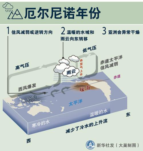 厄尔尼诺又分为厄尔尼诺现象和厄尔尼诺事件。厄尔尼诺现象是发生在热带太平洋海温异常增暖的一种气候现象,大范围热带太平洋增暖,会造成全球气候的变化,但这个状态要维持3个月以上,才认定是真正发生了厄尔尼诺事件。在厄尔尼诺现象发生后,拉尼娜现象有时会紧随其后。
