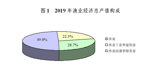 按当年价格计算,全社会渔业经济总产值26406.50亿元,其中渔业产值12934.49亿元,渔业工业和建筑业产值5899.17亿元,渔业流通和服务业产值7572.83亿元,三个产业产值的比例为49.0:22.3:28.7。渔业流通和服务业产值中,休闲渔业产值963.68亿元,同比增长6.81%。