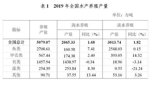 全国水产品总产量6480.36万吨,比上年增长0.35%。其中,养殖产量5079.07万吨,同比增长1.76%,捕捞产量1401.29万吨,同比下降4.45%,养殖产品与捕捞产品的产量比例为78.4:21.6;海水产品产量3282.50万吨,同比下降0.57%,淡水产品产量3197.87万吨,同比增长1.32%,海水产品与淡水产品的产量比例为50.7:49.3。
