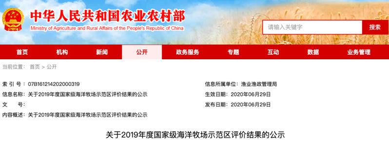 为强化国家级海洋牧场示范区监管,规范引导示范区持续健康发展,充分发挥示范区典型示范和辐射带动作用,根据《国家级海洋牧场示范区年度评价及复查(试行)》(农办渔〔2018〕68号)和《关于做好2019年国家级海洋牧场示范区年度评价工作的通知》(农渔资环便〔2019〕250号)等有关要求,我局组织开展了第一批和第二批国家级海洋牧场示范区年度评价工作。现将国家级海洋牧场示范区2019年度评价结果予以公示,公示期自即日起7个工作日,即6月29日至7日7日,凡对评价结果有异议者,可通过电子邮件和传真于2020年7月7日前向我局反映。反映人需提供真实姓名和联系方式,并提供异议有关依据。