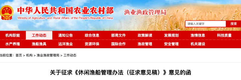 6月30日,农业农村部渔业渔政管理局起草的《休闲渔船管理办法(征求意见稿)》发函,对休闲渔船经营企业、休闲渔船、定点渔港、核定作业场所、作业类型、捕捞限额等作出了明确规定,并要求有关单位在7月17日前反馈意见。