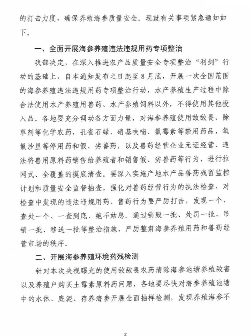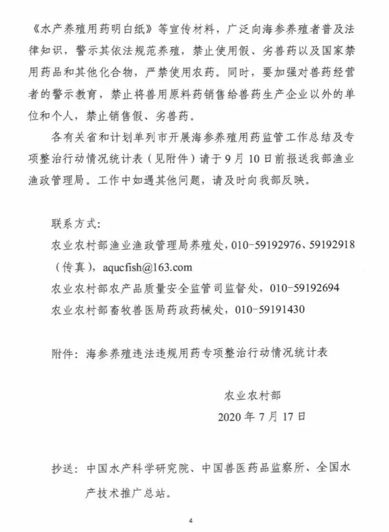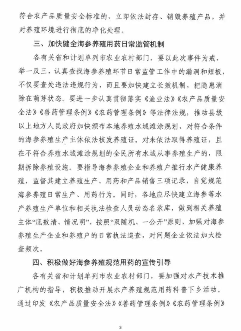 为切实加强海参养殖用药监管,不断加大对违法违规使用农药和禁用药、销售原料药以及无证经营等行为的打击力度,农业农村部7月17日下发《关于加强海参养殖用药监管的紧急通知》,组织各地开展海参养殖违法违规用药专项整治行动。