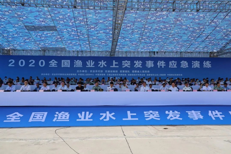 9月11日,农业农村部联合武警部队、交通运输部和福建省人民政府在福建省东山县大澳中心渔港西侧海域共同举办“2020全国渔业水上突发事件应急演练”。农业农村部副部长于康震、中国人民武装警察部队参谋长助理陈锡春少将、福建省副省长李德金出席演练活动。