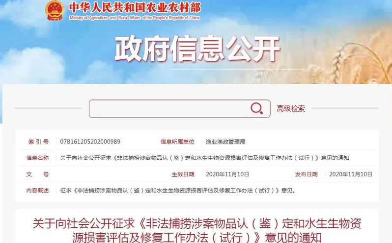 为依法惩治非法捕捞水产品行为,强化水生生物资源保护,推进渔业水域生态文明建设,根据《中华人民共和国渔业法》等法律法规规定,农业农村部研究制定了《非法捕捞涉案物品认(鉴)定和水生生物资源损害评估及修复工作办法(试行)》。