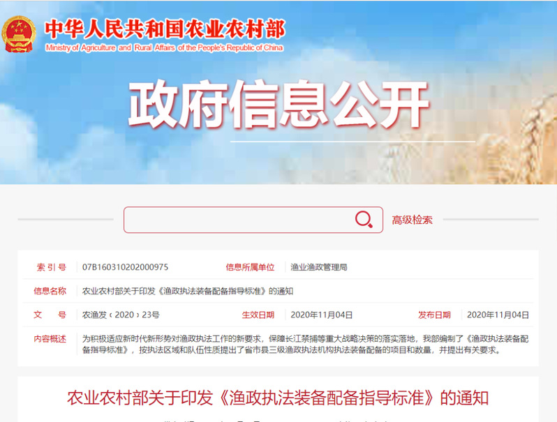 11月4日,农业农村部发布《渔政执法装备配备指导标准》(以下简称《标准》),按执法区域和队伍性质提出了省市县三级渔政执法机构执法装备配备的项目和数量,积极适应新时代新形势对渔政执法工作的新要求,保障长江禁捕等重大战略决策落实落地。