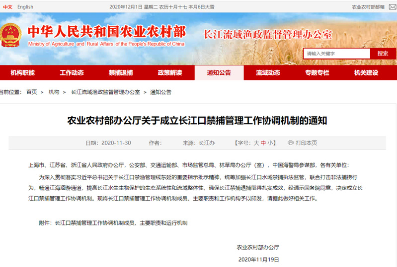 长江口禁捕管理工作协调机制的通知