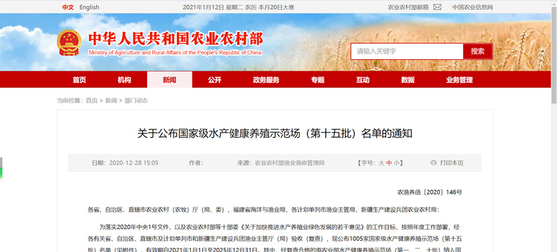 为落实2020年中央1号文件,以及农业农村部等十部委《关于加快推进水产养殖业绿色发展的若干意见》的工作目标,按照年度工作部署,经各有关省、自治区、直辖市及计划单列市和新疆生产建设兵团渔业主管厅(局)验收(复查),现公布1005家国家级水产健康养殖示范场(第十五批)名单(见附件),有效期自2021年1月1日至2025年12月31日。其中,经复查合格的原农业部水产健康养殖示范场(第一、二、十批)纳入国家级水产健康养殖示范场(第十五批)管理。