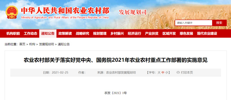2月25日,农业农村部发布《关于落实好党中央、国务院2021年农业农村重点工作部署的实施意见》(农发〔2021〕1号,以下简称《意见》)。