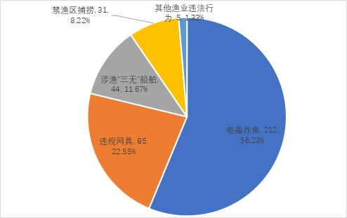 受理的377起举报线索中,海洋为5起,占比1.33%;内陆水域为372起,占比98.67%。按照举报受理类型分类(详细情况见图2、图3),电毒炸鱼类举报受理数量为212起,占总举报受理数量的56.23%,环比增长3.92%,其中电鱼类举报受理数量为203起,占电毒炸鱼类举报受理数量的95.75%;使用绝户网等违规网具进行捕捞的举报受理数量为85起,占总举报受理数量的22.55%,环比减少8.6%;涉渔“三无”船舶的举报受理数量为44起,占总举报受理数量的11.67%,环比减少27.87%;禁渔区内捕捞的举报受理数量为31起,占总举报受理数量的8.22%,环比增长47.62%;其他渔业违法行为的举报受理数量为5起,占总举报受理数量的1.33%。