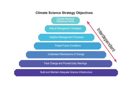 美国国家海洋和大气管理局渔业气候科学战略是围绕7个重要科学目标制定的。这7个目标分别是:科学技术;预测气候影响并提出预警;了解气候变化机制;预测未来渔业环境;适应性管理的过程;强有力的管理策略;气候指引下的参考点。这些目标将为渔业管理决策者提供他们所需的信息,以减少气候带来的环境影响,提高渔业对不断变化的气候和海洋条件的适应能力。