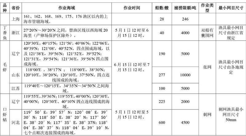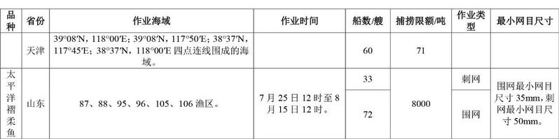 2021年伏休期间专项捕捞许可品种为海蜇、丁香鱼、毛虾、口虾蛄和太平洋褶柔鱼。上述品种专项捕捞许可作业时间、作业海域、作业船数、作业类型、渔具网目尺寸和捕捞限额等详见附件1。