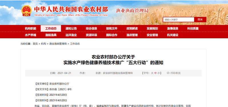 为贯彻落实党的十九届五中全会关于推动绿色发展、加快发展方式转型升级的战略部署和今年中央1号文件“推进水产绿色健康养殖”的部署要求,进一步落实经国务院同意、十部委联合印发的《关于加快推进水产养殖业绿色发展的若干意见》(农渔发〔2019〕1号)相关要求,我部决定在“十四五”期间组织实施生态健康养殖模式示范推广、养殖尾水治理模式推广、水产养殖用药减量、配合饲料替代幼杂鱼和水产种业质量提升等水产绿色健康养殖技术推广“五大行动”(以下简称“五大行动”)。有关事项通知如下。