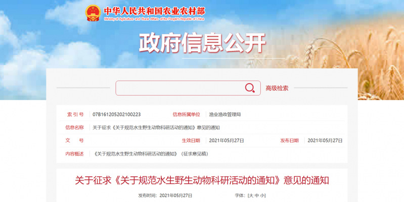 科学研究是水生野生动物保护工作的重要组成部分,同时也是对水生野生动物资源的一种特殊利用方式。为进一步规范水生野生动物科学研究活动,发挥科研单位在水生野生动物保护方面的积极作用,按照《中华人民共和国野生动物保护法》有关要求,我局组织起草了《关于规范水生野生动物科研活动的通知》,现予以公示,公示期为一个月。