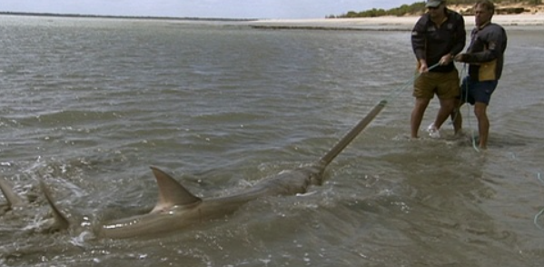 锯鳐的吻齿让它很容易被渔网捕捉到。它的鳍是全球鲨鱼鳍贸易中最值钱的,牙齿被当作装饰品售卖,具有药用价值,它的吻部还可以用来斗鸡。