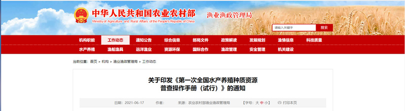 根据《第一次全国水产养殖种质资源普查实施方案(2021-2023)》要求,我局委托全国水产技术推广总站牵头编制了《第一次全国水产养殖种质资源普查操作手册(试行)》(见附件1),现印发给你们,请遵照执行。执行中如有问题和建议,及时向全国水产技术推广总站反映。