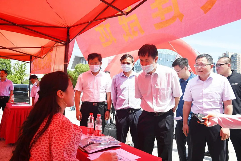 (图:农业农村部渔业渔政管理局局长刘新中(右二)在招聘会现场向招聘企业了解情况)