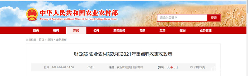 2021年,贯彻落实党的十九届五中全会、中央经济工作会议、中央农村工作会议、中央1号文件精神,围绕巩固拓展脱贫攻坚成果、全面推进乡村振兴、加快农业农村现代化,突出保供固安全、振兴畅循环,国家将继续加大支农投入,强化项目统筹整合,推进重大政策、重大工程、重大项目顺利实施。为便于广大农民和社会各界了解国家强农惠农政策,发挥政策引导的作用,现将2021年财政部、农业农村部实施的重点强农惠农政策发布如下。