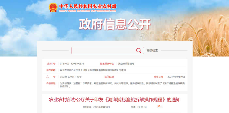 第二十三条本规程自2021年9月1日起实施。原农业部办公厅2012年9月11日印发的《海洋捕捞渔船拆解操作规程(试行)》(农办渔〔2012〕104号)同时废止。