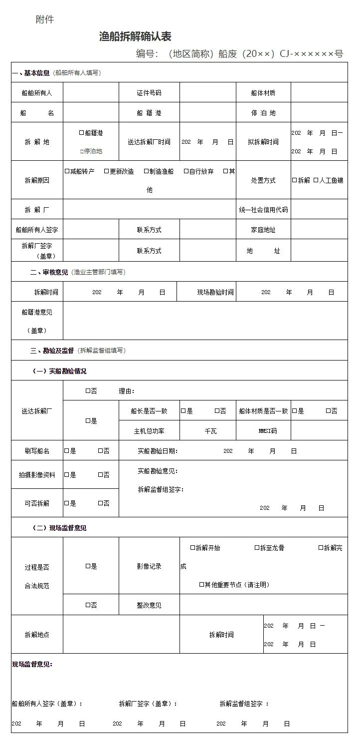 第八条船舶所有人应当在渔船拆解前填写渔船拆解确认表(样式见附件),并向船籍港所在地县级以上地方人民政府渔业主管部门提交以下材料: