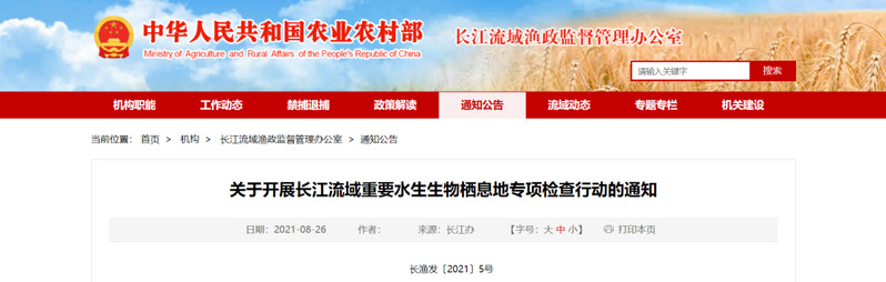 为深入贯彻中央领导关于长江大保护重要指示批示精神,落实《国务院办公厅关于加强长江水生生物保护工作的意见》(国办发〔2018〕95号)有关要求,保护长江流域水生生物资源和水域生态环境,我办决定于2021年9—10月开展长江流域重要水生生物栖息地专项检查行动。请各省市结合本地实际,认真抓好贯彻落实。