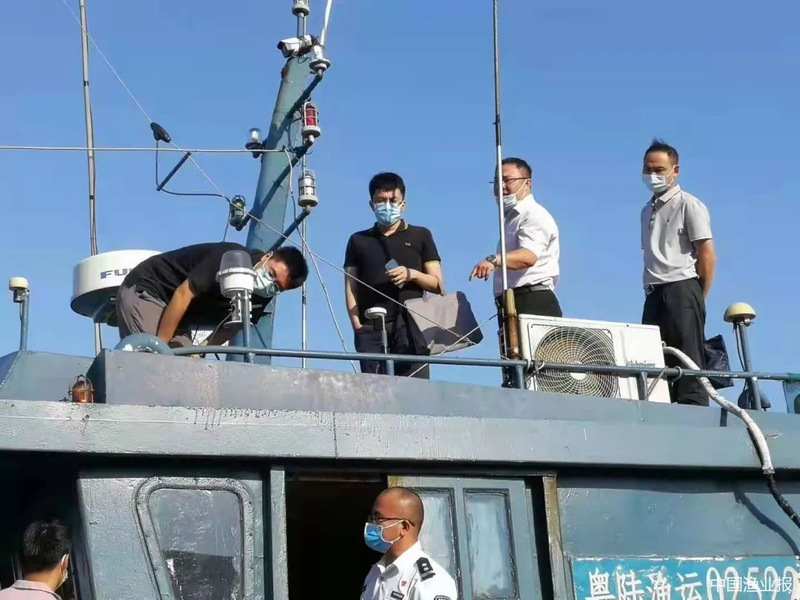 (图:“商渔共治2021”专项行动联合督导检查组在粤陆渔运02522船上检查信号灯等设备)