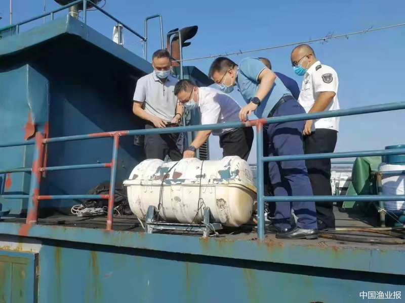 (图:“商渔共治2021”专项行动联合督导检查组在粤陆渔运02522船上检查救生设备)