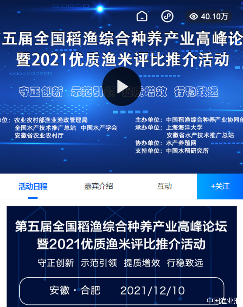 12月10日,由中国稻渔综合种养产业协同创新平台主办的第五届全国稻渔综合种养产业高峰论坛暨2021优质渔米评比推介活动在安徽合肥和上海两地同期举办。活动由农业农村部渔业渔政管理局、全国水产技术推广总站、中国水产学会和安徽省农业农村厅指导,402永利集团、安徽省水产技术推广总站承办,中国水稻研究所支持,水产养殖网协办。农业农村部渔业渔政管理局一级巡视员李书民,全国水产技术推广总站站长、中国水产学会秘书长、中国稻渔综合种养产业协同创新平台理事长崔利锋,402永利集团副董事长江敏,安徽省农业农村厅二级巡视员陈荣文发表视频致辞,全国水产技术推广总站副站长、中国稻渔综合种养产业协同创新平台副理事长于秀娟发布《“十三五”中国稻渔综合种养产业发展报告》。