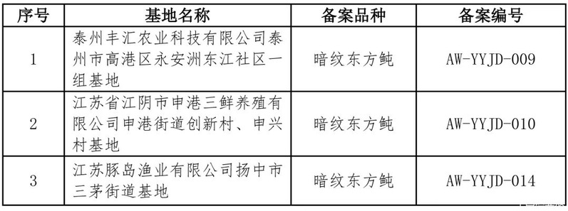 根据《农业部办公厅关于开展养殖河鲀鱼源基地备案工作的通知》(农办渔〔2016〕20号),中国渔业协会组织对泰州丰汇农业科技有限公司、江苏省江阴市申港三鲜养殖有限公司和江苏豚岛渔业有限公司申请的养殖河鲀鱼源基地进行了审查,经材料审核、专家组现场审查和网上公示,泰州丰汇农业科技有限公司泰州市高港区永安洲东江社区一组基地,江苏省江阴市申港三鲜养殖有限公司申港街道创新村、申兴村基地,江苏豚岛渔业有限公司扬中市三茅街道基地符合要求,确定为养殖河鲀鱼源基地,现予以公布。名单如下: