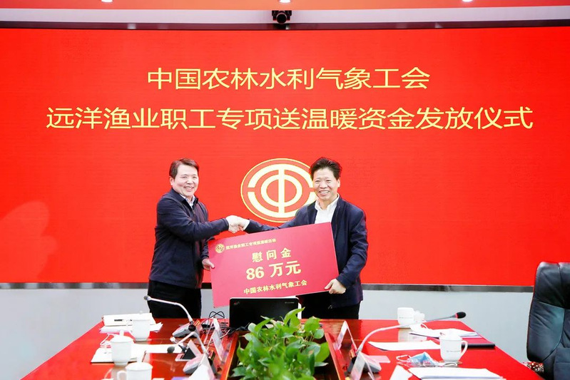长年在海上艰苦劳作的远洋渔业职工为我国远洋渔业发展作出了重要贡献。12月27日,中国农林水利气象工会启动2022年“两节”远洋渔业职工送温暖活动,将86万元送温暖资金发放给受新冠肺炎疫情影响导致生活困难的捕捞、港口、冷库等企业的困难职工,把党和政府的关怀、工会组织的温暖送到职工心坎上。