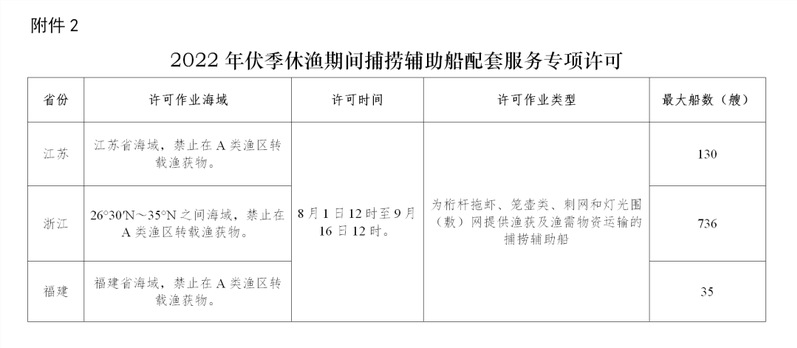 2022年捕捞辅助船配套服务专项许可作业海域、作业时间、渔船数量等详见附件2。